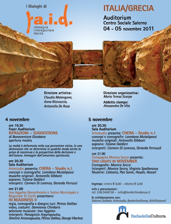 Venerdì 4 novembre, sul palco dell’auditorium del Centro sociale “Cantarella”, sede di tutte le iniziative promosse, la compagnia Iros Aggelos Dance Theatre, in collaborazione col Teatro Municipale e Regionale di Corfù, porterà in scena “In Readness V”, per la regia, coreografia e il disegno luci di Petros Gallias, direttore della compagnia che riunisce in sé 28 artisti tra attori, danzatori, pittori e poeti, intenti nel dar vita a una forma d’arte sincretica in cui ogni linguaggio trova il proprio spazio.
